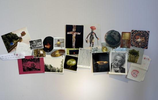 Diese Wandinstallation aus Karten, Zeichnungen, Fotos sind das Herz meiner Gedanken wie Ankerpunkte, die mir helfen in meine innere Welt der Phantasie zu tauchen.